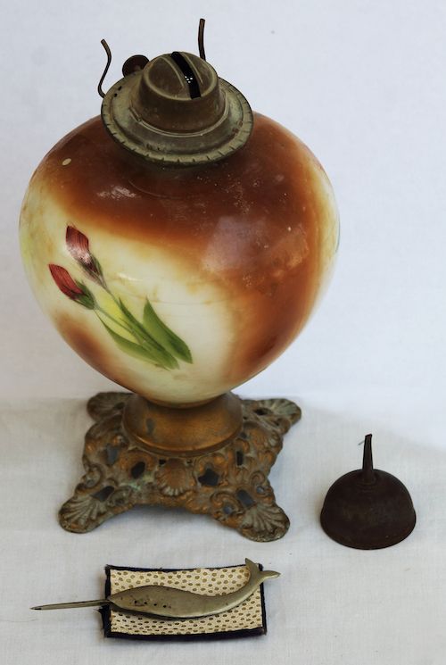 Base de lámpara en porcelana, aceitera para máquina de coser y tejedor de hilo en forma de pescadito.